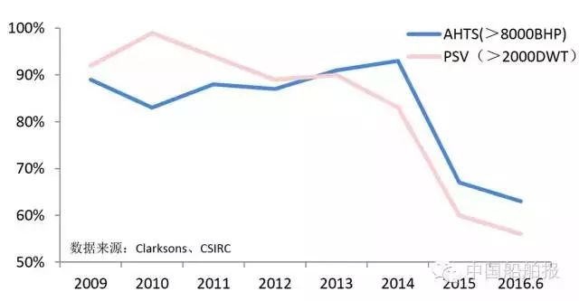 尽管油价出现一定程度的上涨,油气开发项目成本也得到一定程度的压缩,但是2016年上半年海洋油气开发活动依然低迷,海工装备运营市场下行之势依旧难以遏制,新租约减少、已有租约到期和租约提前终止持续打压装备利用率。2016年上半年,自升式钻井平台和浮式钻井平台在租量分别下滑17座和31座/艘,导致利用率分别下滑4个和6个百分点至70%和71%。海工船方面,利用率也继续走低,2016年6月份,8000马力以上三用工作船(AHTS)和2000载重吨以上平台供应船(PSV)利用率分别为63%和56%,均较年初下滑4个百分点。