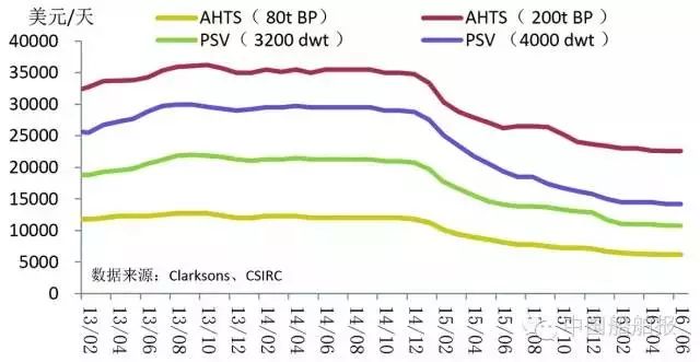 在船队供应严重过剩的背景下,运营市场完全转变为租方市场,运营商之间的竞争加剧,承租人借机压低租金的行为变得极为普遍,导致日租金一降再降。钻井平台方面,2016年6月,自升式和浮式钻井平台日租金分别为7.87万美元和17.12万美元,较年初分别下滑5.4%和14.2%。海工船方面,2016年6月,80吨系柱拉力和200吨系柱拉力AHTS日租金分别为6130美元和22550美元,较年初下滑14.0%和4.8%;3200载重吨和4000载重吨PSV日租金分别为10780美元和14200美元,同比分别下滑16.1%和10.1%。尽管租金持续下滑,但下滑幅度相较2015年同期有所收窄。