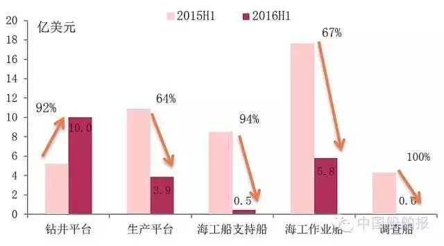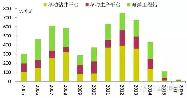 海工装备运营市场持续恶化导致海工运营企业生存空间受到严重挤压,船东毫无订船欲望,大型浮式生产平台总包项目也一推再推,导致海工装备新造市场在2015年的基础上再次大幅萎缩,新订单几近消失。2016年上半年,全球仅成交各类海工装备40座(艘)、金额20.1亿美元,同比分别大幅下滑62.3%和56.7%,成交额更是不足2014年同期的十分之一。