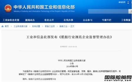 9月5日,工信部网站发布《船舶行业规范企业监督管理办法》(以下简称方法),方法称,为加强符合《船舶行业规范条件》企业的动态管理,规范监督检查、变更、整改、撤销公告等管理事项及程序,工信部制定了《船舶行业规范企业监督管理办法》,该方法自2016年10月1日起实施。