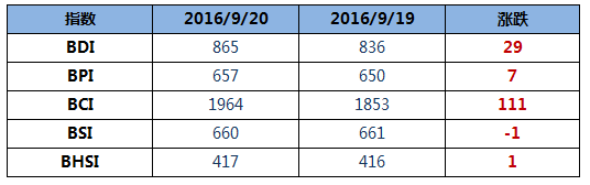 国际船舶网9月20日消息,波罗的海干散货运价指数(BDI)周二大涨29点,或环比上升3.47%,为865点。波罗的海好望角型散货船运价指数(BCI)上升111点,或环比上升5.99%,至1964点。波罗的海巴拿马型散货船运价指数(BPI)上升7点,或环比上升1.08%,为657点。波罗的海超灵便型散货船运价指数(BSI)下降1点,或环比下降0.15%,至660点。波罗的海灵便型散货船运价指数(BHSI)上升1点,或环比上升0.24%,至417点。