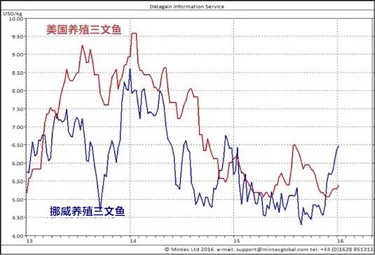 自2015年下半年以来,挪威三文鱼养殖成本上涨约30-31克朗/公斤,因此售价一路飙升,同时,由上图可见,挪威三文鱼价格波动也影响到美国养殖三文鱼。