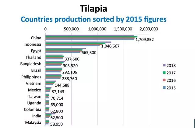 图为2015-2018年*全球各国罗非鱼产量(自上而下分别为中国、印尼、埃及、泰国、孟加拉、巴西、菲律宾、越南、墨西哥、台湾、乌干达、哥伦比亚、印度、马拉西亚)