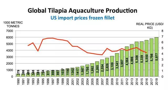 图为1990年-2018年*全球罗非鱼养殖数量和出美价格对比图绿色方块为全球罗非鱼总产量变化,红线为价格变化趋势