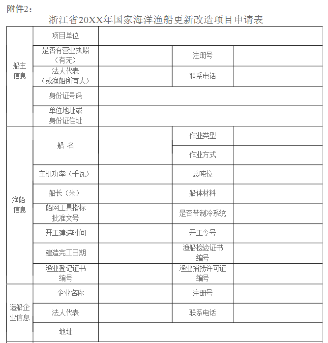 (1)《浙江省20××年国家海洋渔船更新改造项目申请表》(附件2);