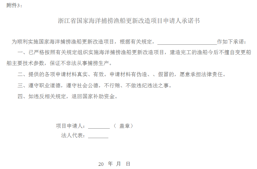 (2)《浙江省国家海洋渔船更新改造项目申请人承诺书》(附件3);