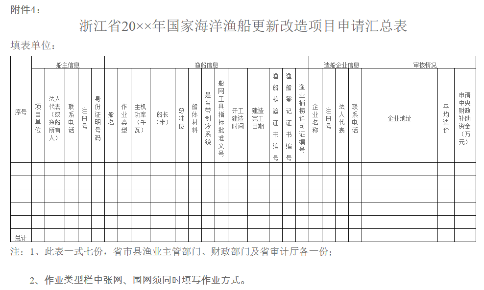 (2)浙江省20××年国家海洋渔船更新改造项目申请汇总表(附件4);
