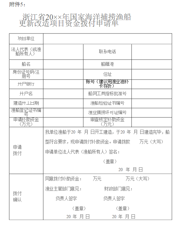 5.浙江省20××年国家海洋捕捞渔船更新改造项目资金拨付申请单