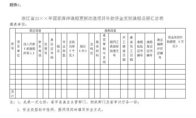 6.浙江省20××年国家海洋渔船更新改造项目补助资金发放渔船名册汇总表