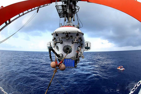 在马里亚纳海沟作业区,“蛟龙”号载人潜水器离开“向阳红09”科学考察船缓缓进入水中(6月1日摄)。