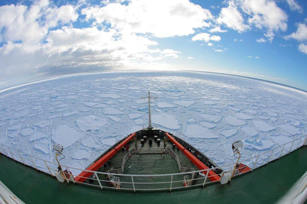 中国第33次南极科考队搭乘“雪龙”号科考船驶往维多利亚地特拉诺湾方向(2月3日摄)。
