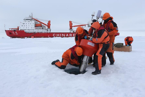 中国第七次北极科学考察队队员在短期冰站布放中国自主研发的冰基拖曳式海洋剖面浮标(2016年8月18日摄)。