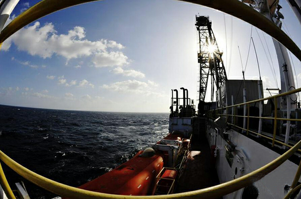 33名中外科学家乘坐美国“决心”号大洋钻探船抵达南海目标海域,开始进行第三次南海大洋钻探(2月14日摄)。