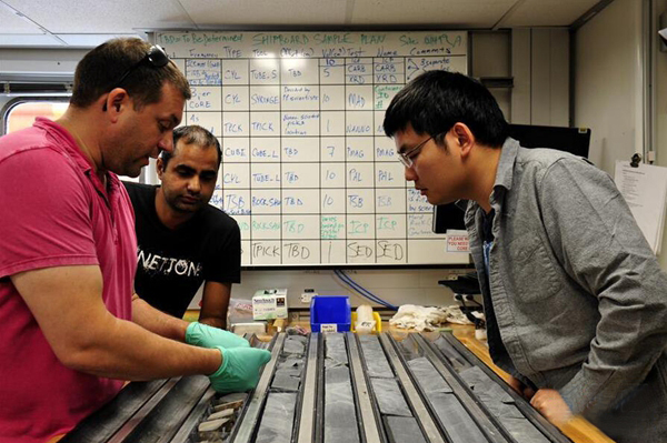 在第三次南海大洋钻探中,中外科学家在美国“决心”号大洋钻探船上观察研究玄武岩岩芯样品(3月25日摄)。