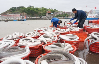 渔法:作业前根据海况,鱼群栖息情况确定作业渔场,先用测深锤或探鱼仪探测水深,然后确定放浮标绳的长度,即下钩深度。作业时以北涨和南流下钩较好,下钩前应了解潮流转向,一般采用横风横流或横风偏流下钩使干线与流向横切。大潮汛在平潮前1小时左右下钩,小潮在平潮前2小时半下钩下完钩后渔船回到第一支浮标的位置, 待1小时后收钩,若再遇流急,钓具移动快,鳗吃饵差,易再推迟半小时收钩,每天下、起钩约2--3次,母船也可下钩生产同时照顾舢板,通报渔情,指挥生产。春、冬汛渔场水深一般在40--60米, 夏汛在30--40米。作业中根据渔场水深调整浮标绳长度,浮标绳长度可比放钓水深长5米左右,夏汛鳗鱼有钻泥习性钓钩应刚好着底;风大流急,浮标绳应放长些,小潮流缓时放出的浮标绳长度大致同水深。目前流行的延绳钓作业是由两排干线(也称线)组成U型,一共有14海里长,两排之间相距约0.5海里,在一根绲线上,每隔6米系一根支线,并且在支线末端挂上鱼钩,通过放钓、起钓、理钓,循环往复进行作业。