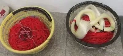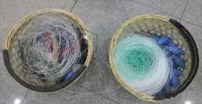 渔具装配:干线: 乙纶42特×2×2捻线,长202.8米。支线:分3段,第一段乙纶42特4×2×2捻线,长4.6米;第二段为直径0.3毫米钢丝1×4捻成,长36厘米;第三段为直径0.3毫米钢丝1×10捻成,长2.5厘米。钓钩:直径2.2毫米钢丝制成圆形钩,有倒刺,钩轴长63毫米,钩宽16.5毫米,尖高21毫米。沉子:石块重180克,用网片或铁丝包扎,每条干线用4个,沉子绳材料结构同浮子绳,度2.9米,用量同沉子。浮子:硬质塑料浮子,静浮力50克力的每条干线用4个;泡沫塑料浮子静浮力9克力的每条干线用5个,浮子绳用乙纶42 特4×2×2捻线,长10厘米,每条干线用9条。沉石:石块重1.25公斤每条干线用1个. 碇石:石块重1.4公斤每条干线4浮标:竹竿直径2厘米,长2.9米,上端结小布旗或棕片,中间结1个浮筒,下端结1块沉石,每条干线1支。浮标绳用乙纶42特16×2×2捻线,长66米,每条干线用2条。浮筒:竹筒去皮,直径10厘米长35厘米静浮力2.5千克力每条干线1个。干线两端各留7.8米端距,然后,每隔7.2米系1条支线或沉子绳共27条,其中系钩支线23条,沉子绳4条,干线之间使用活络连接。支线下端用系钩线结钓钩,上端系在干线上,干线的头尾2段各装4个钩,中间3段各装5个钩。每条干线装9个浮子,其中静浮力9克力的泡沫塑料浮子5个; 静浮力50克力的硬塑料浮子4个,首尾隔4条支线装配1个沉子,中间每隔5条支线装1个沉子每条干线共装4个沉子。